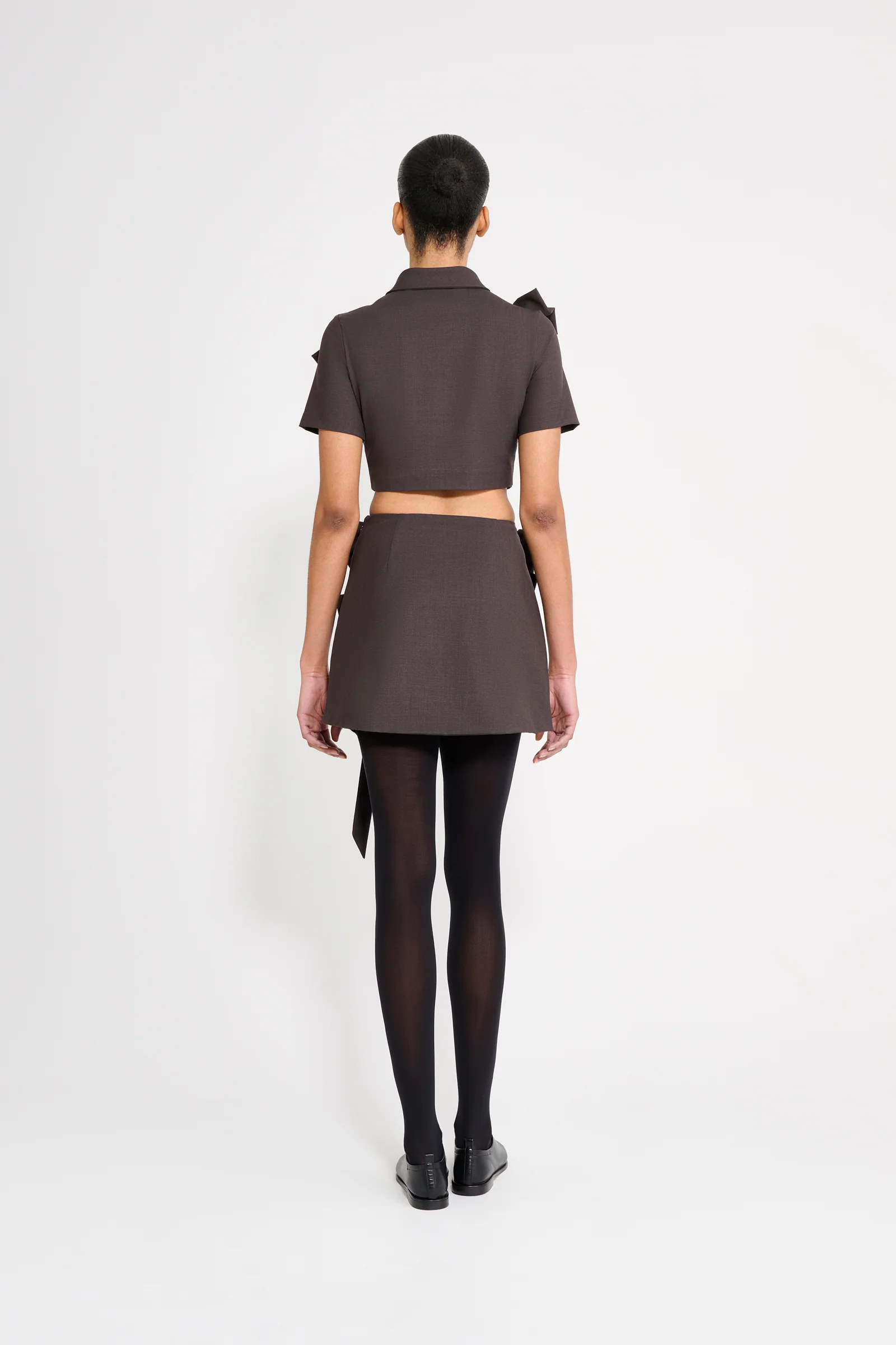The wool skirt features the seasonal bow bouquet technique, where timeless elegance meets refined craftsmanship in a seamless fusion of sophistication and grace.