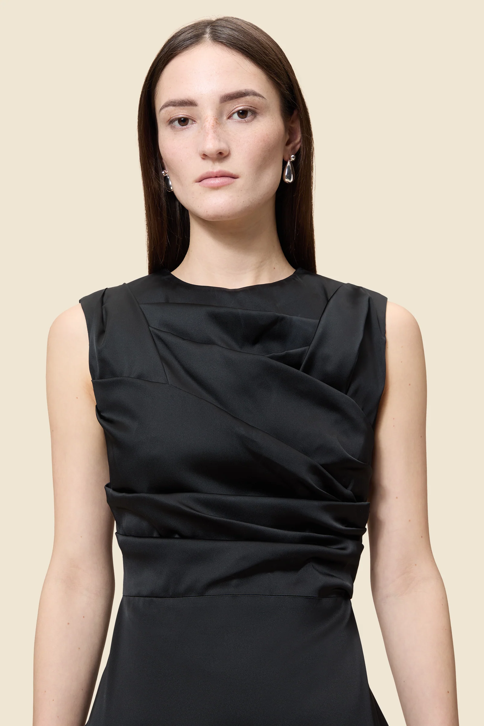 The meticulously placed pleats and stretch satin define the elegance of the dress, reflecting classic Haute Couture craftsmanship with a modern edge.